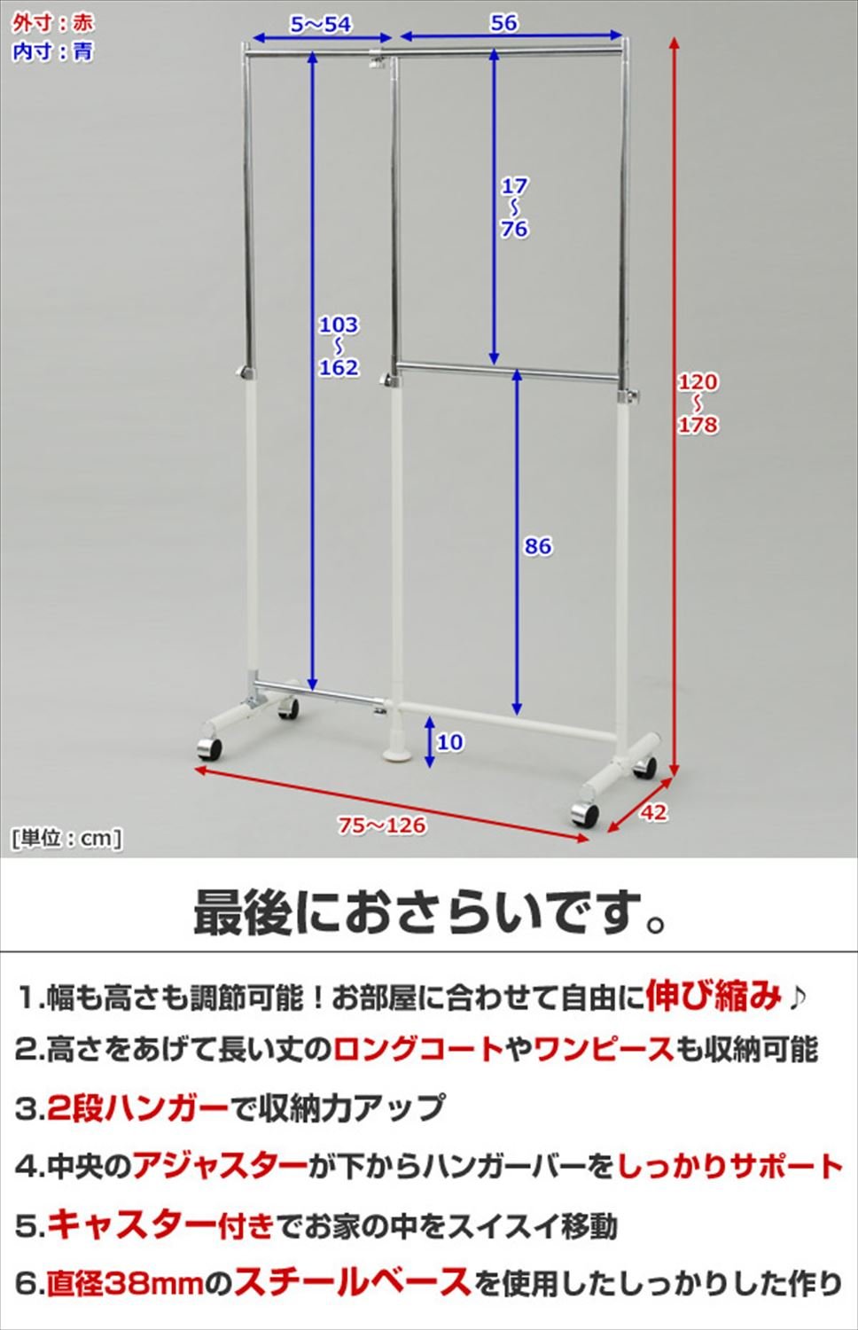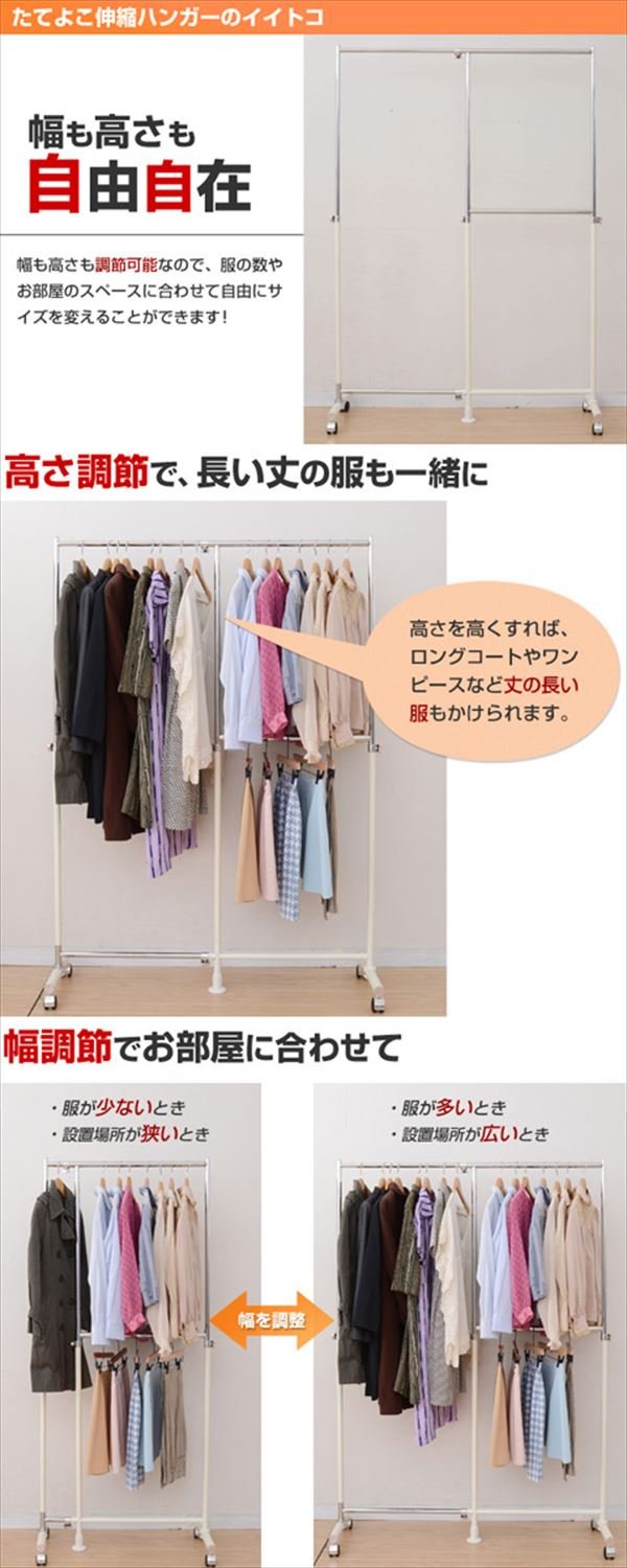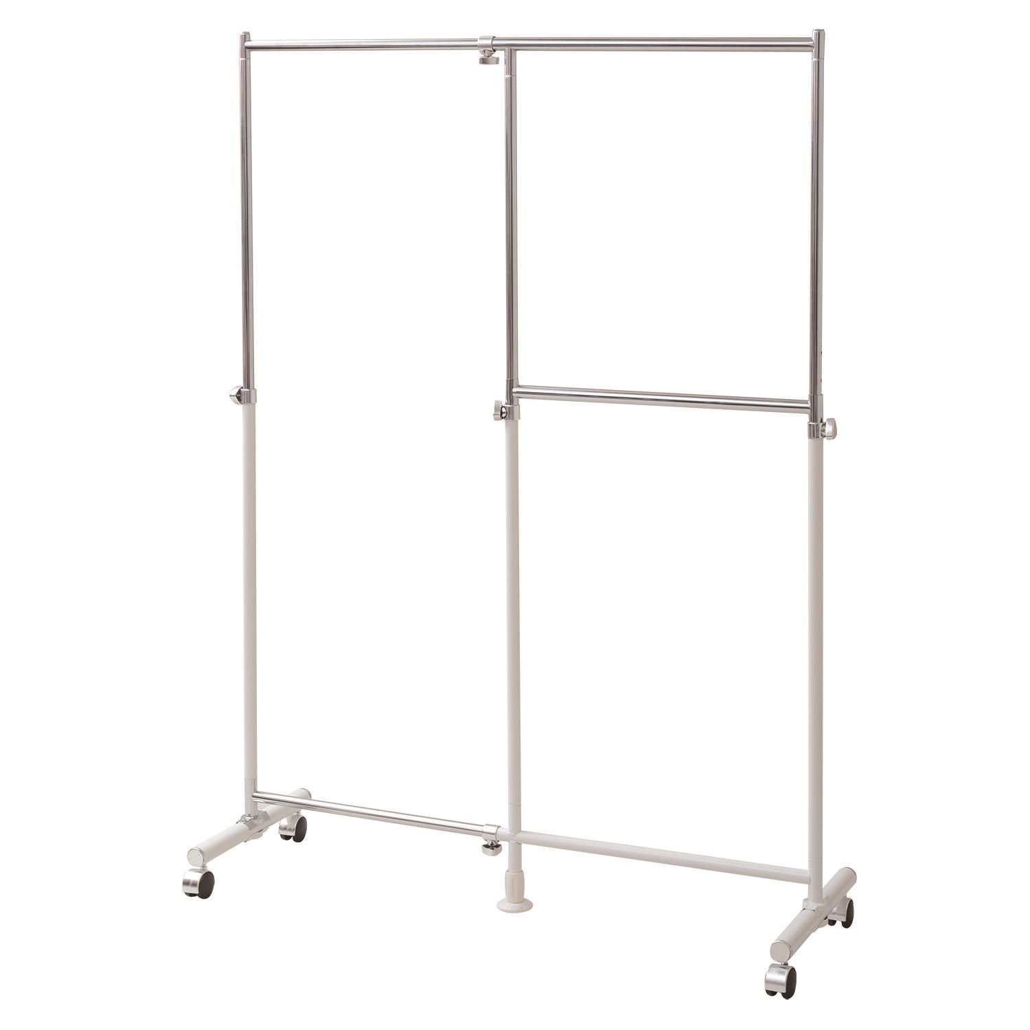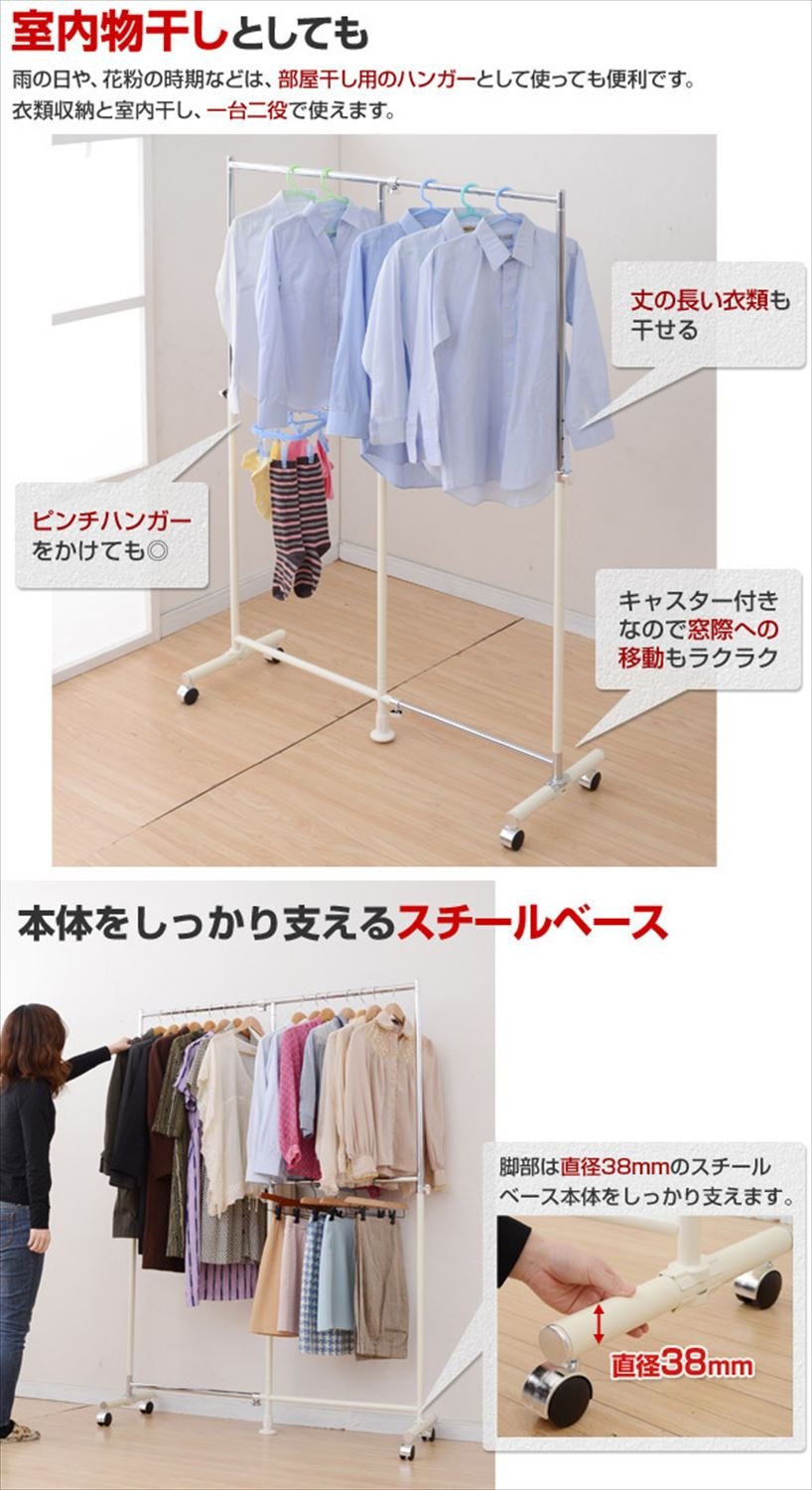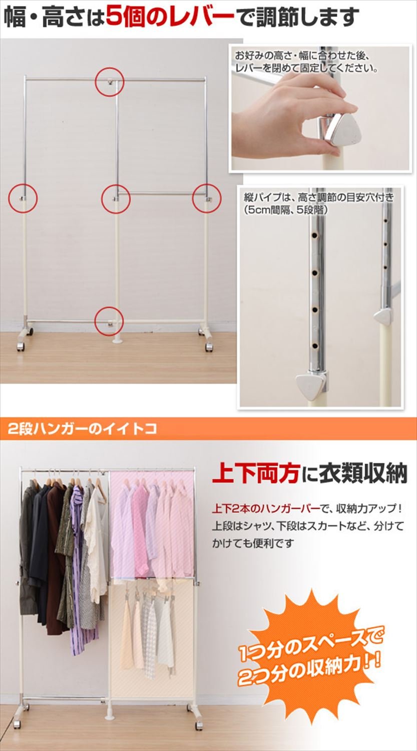 Two-stage hanger space that can double by the center adjuster and steel base with a diameter of 38 mm firmly supports the whole ● Easy to move with casters (no stopper) ● Overall load capacity: 40 kg ● Long space inside dimension: width 5-