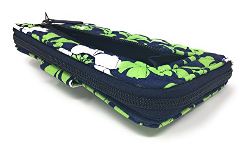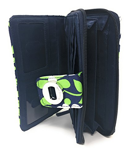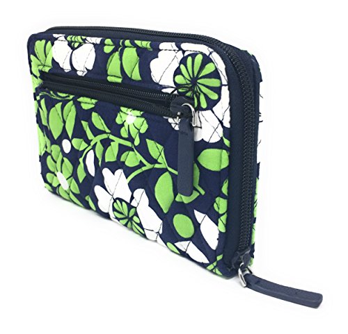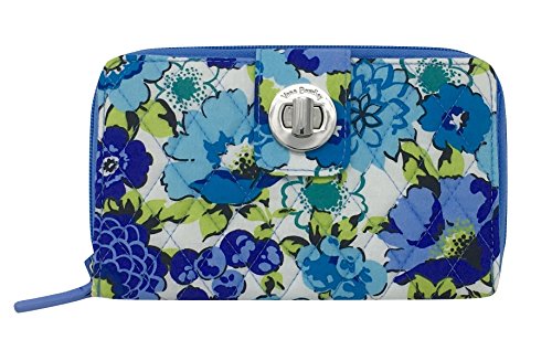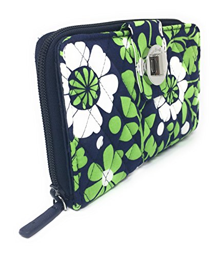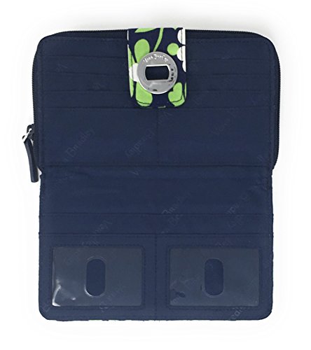 Vera Bradley's spacious Turnlock Wallet is made of soft quilted fabric on the outside with a coordinating solid custom print logo fabric on the interiors. There are two main compartments - a zip around portion features 6 card slots and two full length bill compartments. The tab and turn lock closure portion features another 6 card slots, 2 clear ID slots and a full length bill compartment. The back exterior features a zippered pocket. It measures approximately 7 3/4 inches (L) x 4 3/4 inches (H) x 1 inch (W). The location of pattern varies with each wallet. Spot clean with a damp cloth and mild soap. Patterns with solid color interiors are designed and manufactured for Vera Bradley Outlets.Feature