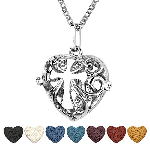 Top Plaza Aromatherapy Essential Oil Diffuser Necklace Antique Silver Heart Shape Locket Pendant With 7 Dyed Lava Rock Stone(Hollow Cross)