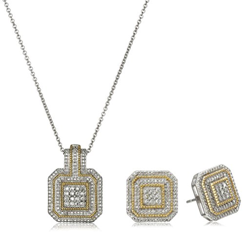 -. Binding : Jewelry -. Brand : Amazon Collection -. Color : White -. Department : womens -. Feature : Two-piece gold-tone sterling silver geometric-shape pendant necklace and stud earrings set each featuring pave-set diamond accents / All our diamond suppliers confirm that they comply with the Kimberley Process to ensure that their diamonds are conflict free. / Imported -. Label : Amazon Collection -. Manufacturer : Amazon Collection -. Model : 37328/STGSIL/J1/SIL030RLO/STD -. MPN : 37328/STGSIL/J1/SIL030RLO/STD -. PackageQuantity : 1 -. PartNumber : 37328/STGSIL/J1/SIL030RLO/STD -. ProductGroup : Jewelry -. ProductTypeName : FINEOTHER -. Publisher : Amazon Collection -. Studio : Amazon Collection -. Title : Yellow Plating Over Sterling Silver with White Diamond-Accent Box Jewelry Set