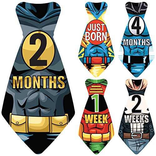 -. Title : NEW! Stick'Nsnap (TM) 17 Baby Monthly Necktie Onesie Stickers - "Happy Heroes" (TM) Milestones for 12 Months + for a limited time, 5 Bonus Milestones - Great Baby Shower Gift!