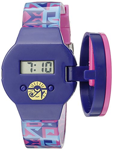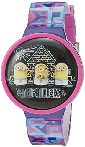 -. Feature : Fun plastic flip-top watch with dark magenta and blue band, 2 extra plastic interchangeable minions Egyptian graphic tops / Watch has buckle closure; quartz movement; not waterproof / Quartz Movement / Case Diameter: 31.57mm / Not Water Resistant