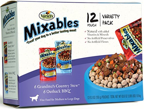 -. Binding : Misc. -. Brand : Variety -. EAN : 0876940000802 -. Feature : Mixable is the original wet dog food designed to mix with any dry dog food; Mixable recipes come in easy to open and use pouches / Natural with Added Vitamins and Minerals / No Artificial Flavors and No Preservatives / Prepared and Made with Pride in the USA / Grandma's and Outback are formulated to meet the nutritional levels established by AAFCO Dog Food Nutrient Profiles for Growth and Maintenance -. Label : Variety -. Manufacturer : Variety -. Model : 00080 -. MPN : 00080 -. PackageQuantity : 1 -. PartNumber : 00080 -. ProductGroup : Pet Products -. ProductTypeName : PET_SUPPLIES -. Publisher : Variety -. Size : 127.2 -. Studio : Variety -. Title : Variety 00080 12/5.3-Ounce Mixables Beef Lovers Natural Dog Food, Includes 6-Grandma's Country Stew and 6-Outback BBQ, 2-Pack -. UPC : 876940000802