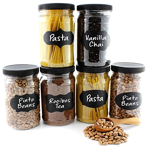 32oz Clear Plastic Jars with Black Ribbed Lids and Chalk Labels (6 pack): BPA Free PET Quart Size Canisters for Kitchen & Household Storage of Dry Goods, Peanut Butter, and More