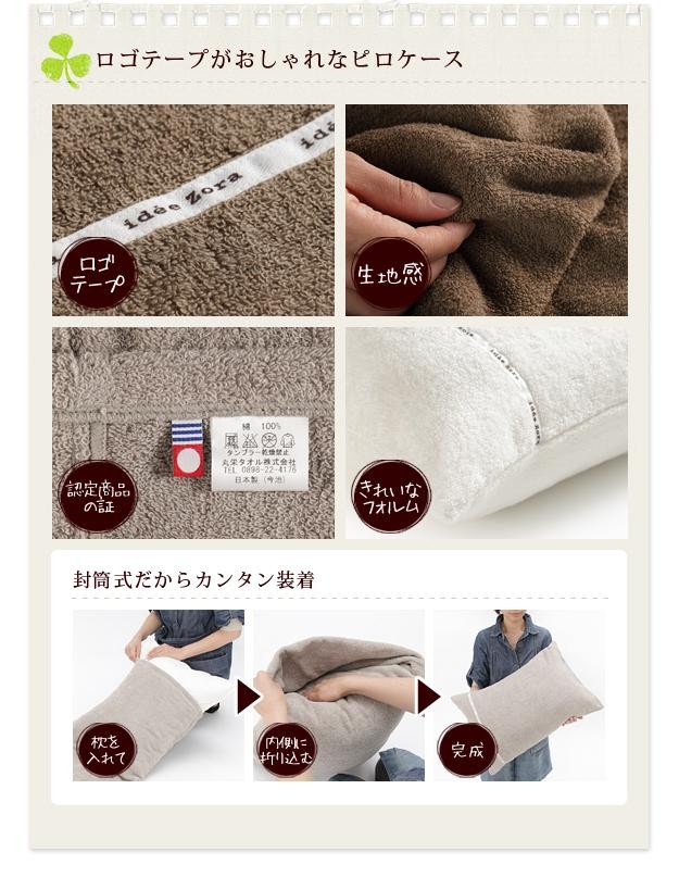 商品について:歴史の長い今治産のタオル生地でできたピローケースです。フワフワの感触が本当に気持ちいい一品。グルッと一周しているロゴテープがワンポイント。封筒式なのでカバー交換も簡単。低ホルムアルデヒドで小さなお子様のアレルギーにも安心です。年間通して使うことができ、シンプルで使う人を選ばないのでギフトにもどうぞ。