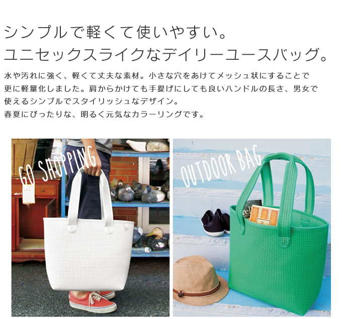 | ポイント | シンプルで軽くて使いやすい。ユニセックスライクなデイリーユースバッグ。 水や汚れに強く、軽くて丈夫な素材。小さな穴をあけてメッシュ状にすることで更に軽量化しました。 肩からかけても手提げにしても良いハンドルの長さ、男女で使えるシンプルでスタイリッシュなデザイン。 |