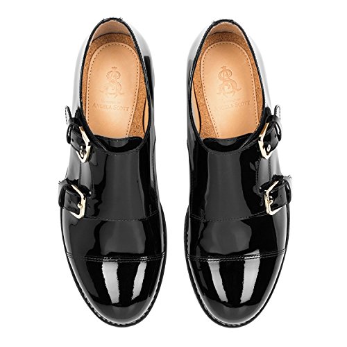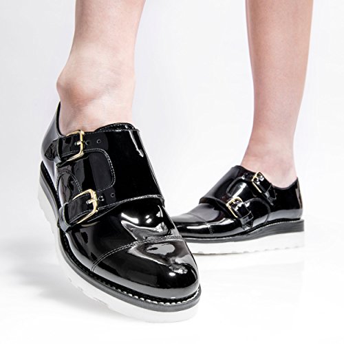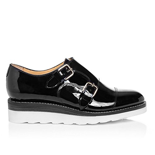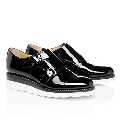 Product DescriptionBlack Italian patent leather wedge monkstrap with stacked leather ski wedge and rubber outsole from The Office of Angela Scott.0
