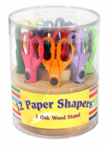 Paper Shaper decorative scissors that cut shapes. Ideal for unique edges and borders in 12 designs for use in memory-making, scrapbooks, stationery, paper crafting, gift wrapping, and much more! Comfortable and sturdy molded plastic handles. Stainless steel blades. Comes in a solid oak round stand and includes: Dragon Back, Deckle, Bat Wings, Bell, Imperial, Cracker, Colonial, Majestic, Arabian, Provincial, Bubbles, and Large Pinking.Feature