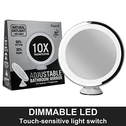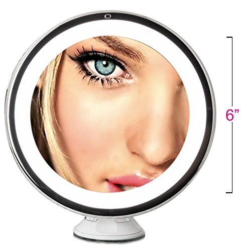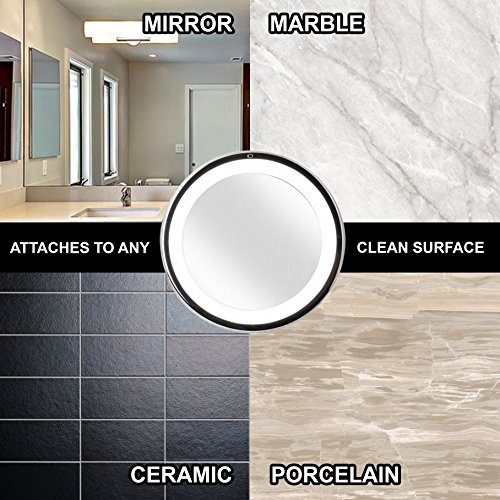 Highlights: • Natural Daylight LEDs • Easy-Lock Suction Mechanism • 360° Rotating swivel • 6" Ultra-Clear Glass Screen • Chrome Finish • 10X Magnification • Sticks to Any Clean, Flat, and Smooth Surface • Requires 3 AA Batteries (Not Included)