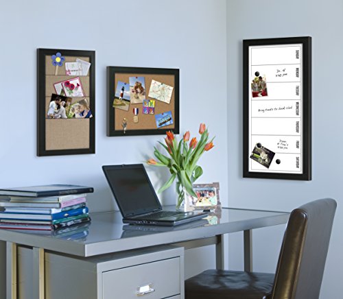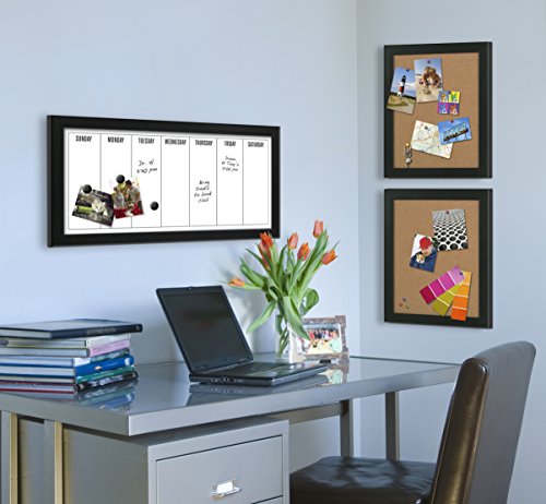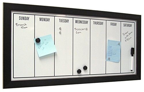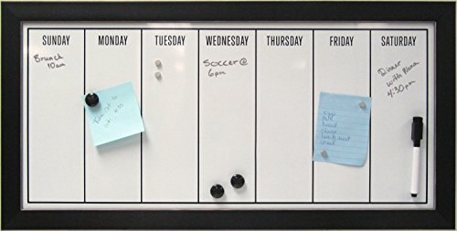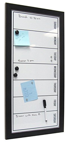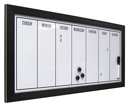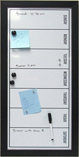- Feature : Organize your schedule and your life with this weekly calendar magnetic dry erase board. Includes magnets to hold photos, receipts, reminders, or other odds and ends for home office or entryway display / Days of the week magnetic whiteboard fits into your existing home decor with its solid black frame with thin white profile accent / Black framed magnetic whiteboard with 11 inch by 24 inch surface with the days of the week printed on the surface. Also includes 3 black magnets with .75 inch diameter, 4 silver magnets with .3 inch diameter, and a black dry erase marker with an eraser cap / Hangers included on the back for horizontal or vertical wall display / Outer Dimensions are 26 inches high by 13 inches wide by 0.825 inches deep