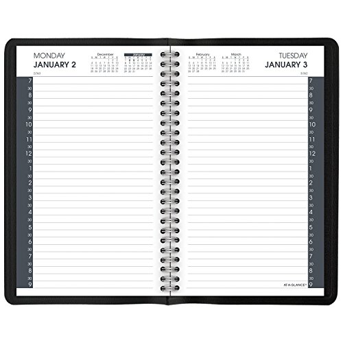 -. Feature : 12 month date range covers a full calendar year from January - December; Julian dates; one day per page with half-hourly appointments so you can easily keep track of your schedule, 7:00a.m - 9:00 p.m; including full weekends / Appointment book is wirebound for durability and features a black, simulated leather cover / Page size 4-7/8 x 8 inches, overall size is 5-3/4 x 8-3/10 inches; P.R.Inted on quality paper with at least 30% post-consumer material