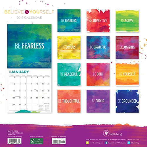-. Binding : Office Product -. Brand : TF Publishing -. EAN : 0619344316304 -. Feature : 2017 calendar featuring beautiful full color photographed images for every month of the year / Includes holidays and observances / Perfect for office spaces, bedrooms, classrooms and more / Makes a great gift for friends and family / Keep your appointments and birthdays organized in one place -. Label : TF Publishing -. Manufacturer : TF Publishing -. Model : 17-1023 -. MPN : 17-1023 -. NumberOfItems : 1 -. PackageQuantity : 1 -. PartNumber : 17-1023 -. ProductGroup : Office Product -. ProductTypeName : OFFICE_PRODUCTS -. Publisher : TF Publishing -. Studio : TF Publishing -. Title : TF Publishing 2017 Monthly Wall Calendar - Believe in Yourself -. UPC : 619344316304