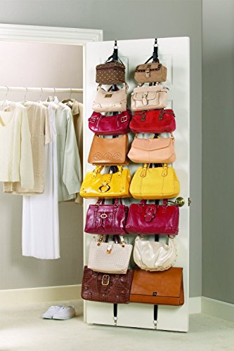 - Feature : Two packages of Over the Door Purse Rack hanging storage systems / The 2-pack includes 2 straps with 8 hooks each designed to hold purses weighing up to 8 pounds / Hooks will accommodate most widths of purse straps are adjustable for customizable storage / The Purse Racks easily fit over the closet door or can be mounted on the wall / great for organizing scarves, belts and hats