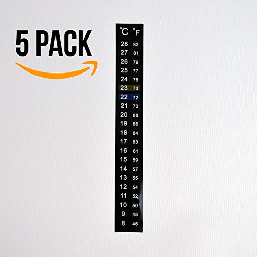Product Description (Pack of 5 Thermometers) This sleek adhesive LCD fermenter thermometer accurately measures temperatures between 46-82F, or 8-28C (both celsius and fahrenheit scales are displayed). Water resistant design adheres to curved surfaces easily. Never worry about the temperature of your fermenting beer, wine or kombucha again - this crystal strip thermometer is the only one you'll need. 0