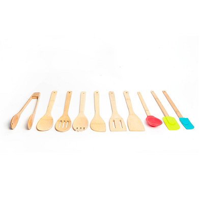 Studio : Generic Publisher : Generic Product Description Complete your kitchen when as you add the ten piece bamboo and silicone tool set. Take care of all of your culinary needs when your utensils are made from sturdy bamboo and silicone to handle your messiest cooking projects. 0