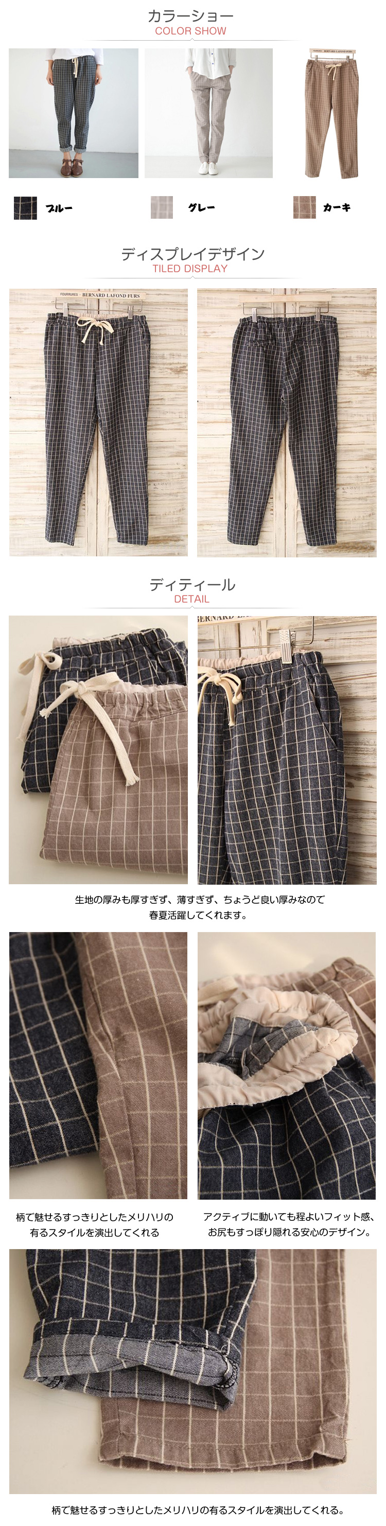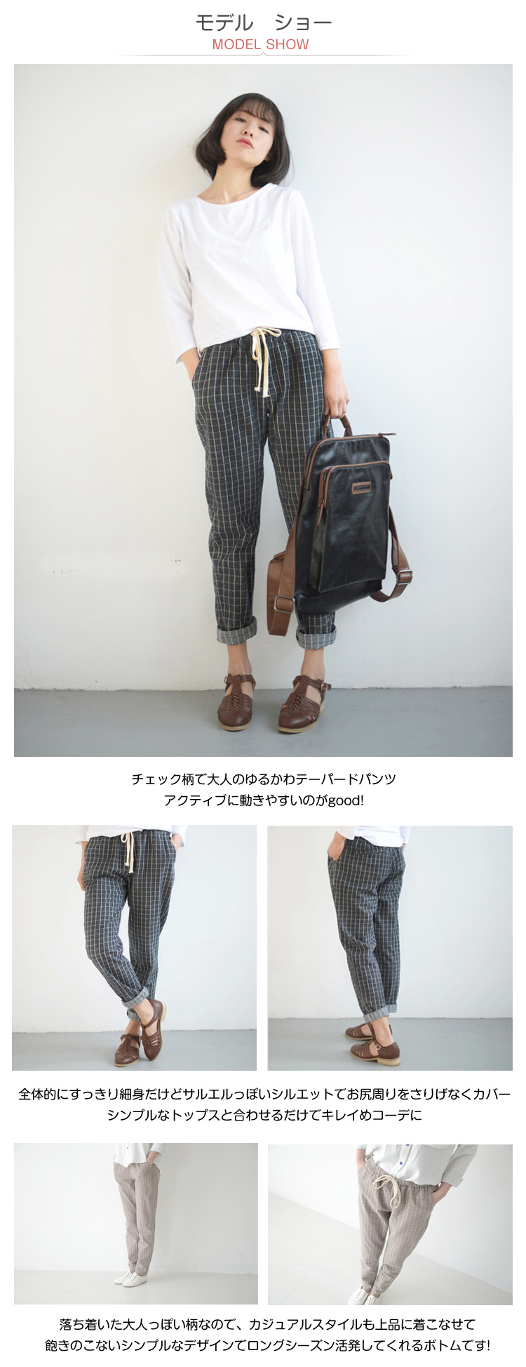 | チェック柄で大人のゆるかわテーパードパンツアクティブに動きやすいのがgood!機能的なサイドポケット付きでちょっとのお出かけもok全体的にすっきり細身だけどサルエルっぽいシルエットでお尻周りをさりげなくカバーシンプルなトップスと合わせるだけでキレイめコーデに落ち着いた大人っぽい柄なので、カジュアルスタイルも上品に着こなせて飽きのこないシンプルなデザインでロングシーズン活発してくれるボトムです! | |