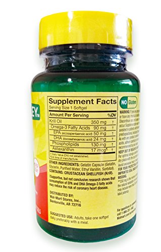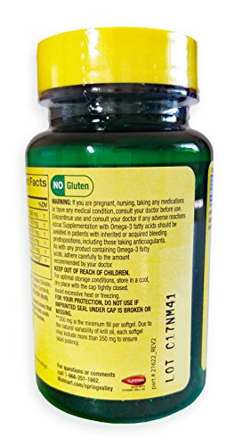 Studio : Spring Valley Publisher : Spring Valley Binding : Health and Beauty Product Description Krill Oil Small Soft gels. Dietary Supplement. Heart Health. 100% pure. Made with Superba krill oil. 90 mg of Omega-3. Supports heart health. No fishy aftertaste Only 1 per day. No gluten, sugar, salt, yeast, wheat, milk, preservatives, soy or artificial colors. Mini Pill Container color May Vary, 0