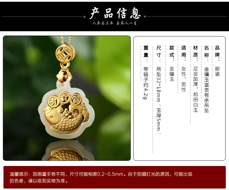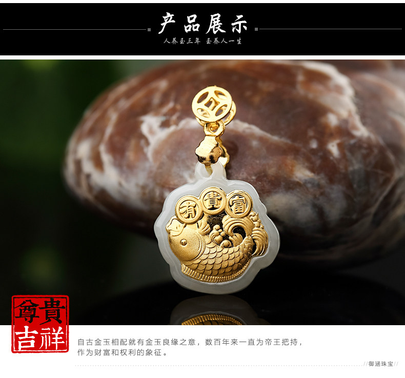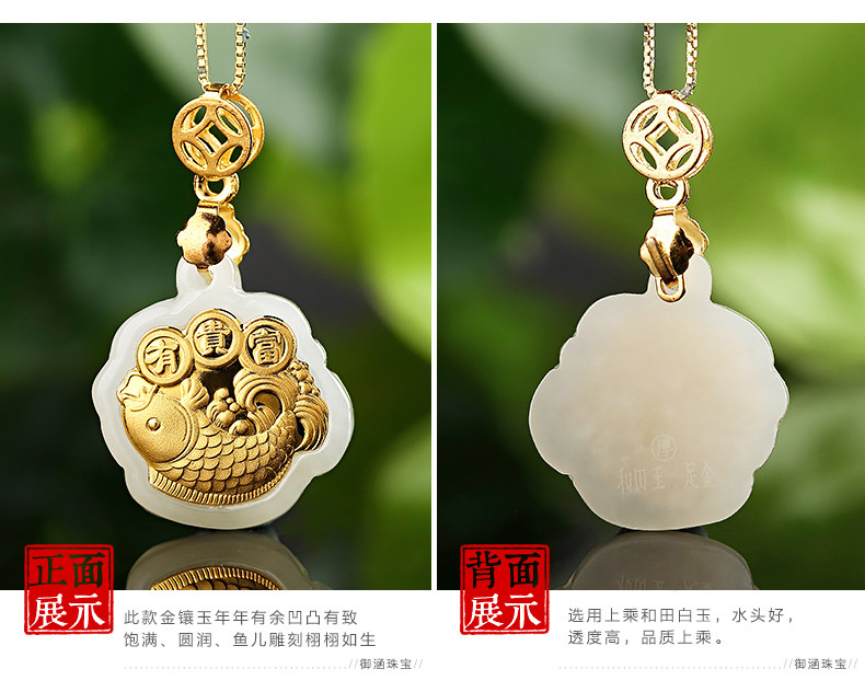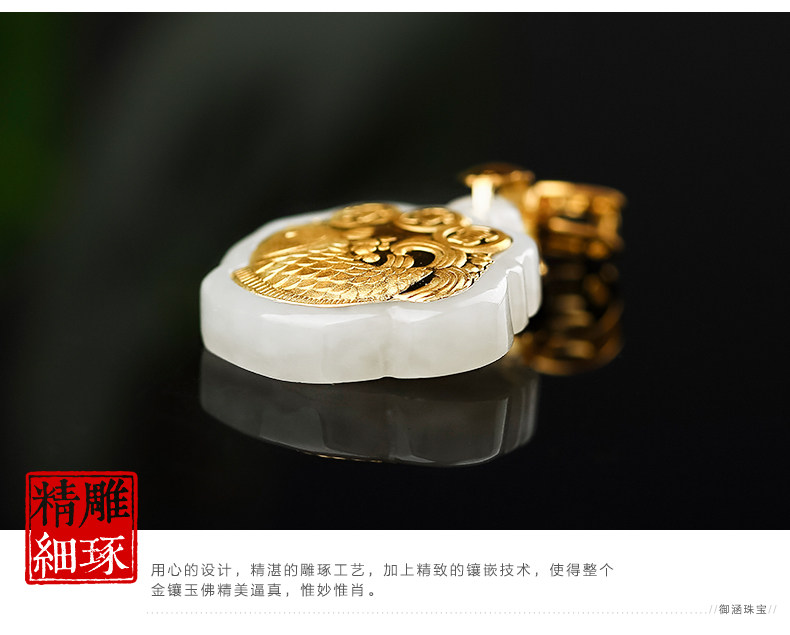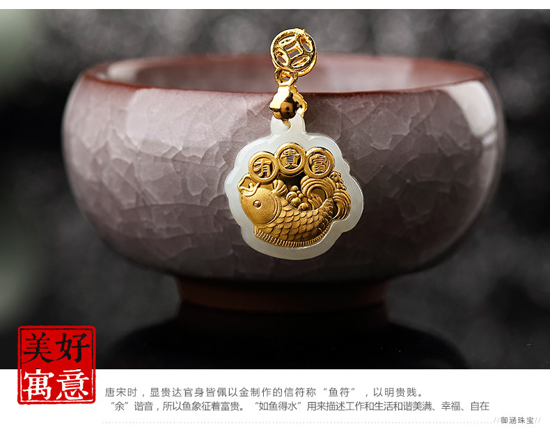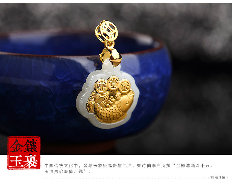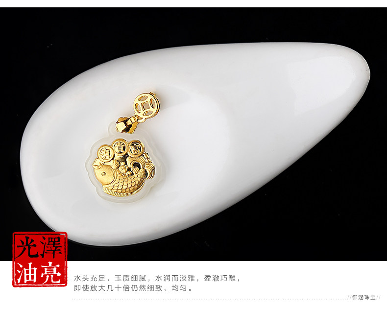 足金镶嵌和田玉鲤鱼吊坠 天然玉佩玉石项链宝宝女款年年有余