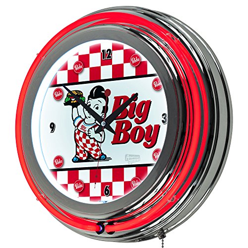 -. Binding : Sports -. Brand : Bob's Big Boy -. Color : Red -. EAN : 0886511587854 -. Feature : High Grade Glass Cover, High Polished Chrome Finish Molded Resin Housing / Officially Licensed Full Color Logo on the Clock Dial / Double Ringed Neon (Outside Ring Coordinates with Printed Logo and Inside Ring Illuminates the Clock Face) / Battery Operated Quartz Clock Mechanism, Requires 1 AA Battery for Clock Operation (Not Included) / AC Power Adapter with 6 ft. Cord, Wall Hanging Mount, Dimensions: 3 x 14.5 x 14.5 inches -. IsAutographed : 0 -. IsMemorabilia : 0 -. Label : Trademark Global -. Manufacturer : Trademark Global -. Model : AR1400-BOB-C -. MPN : AR1400-BOB-C -. PackageQuantity : 1 -. PartNumber : AR1400-BOB-C -. ProductGroup : Sports -. ProductTypeName : SPORTING_GOODS -. Publisher : Trademark Global -. Studio : Trademark Global -. Title : Bobs Big Boy Checkered Chrome Double Ring Neon Clock -. UPC : 886511587854