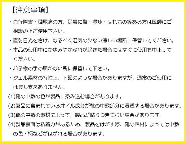 | 衝撃吸収に優れた透明ジェルが足全体にかかる衝撃をしっかり吸収。疲れ・痛みを緩和します。突起加工を採用しているため前すべりを防止。ピタッと貼るだけで使える粘着タイプです。パンプス、サンダル、ミュール、ブーツにお使いいただけます。 |