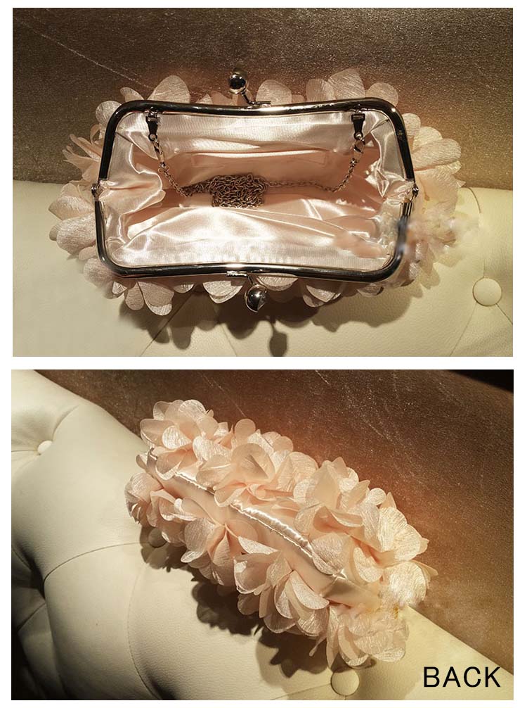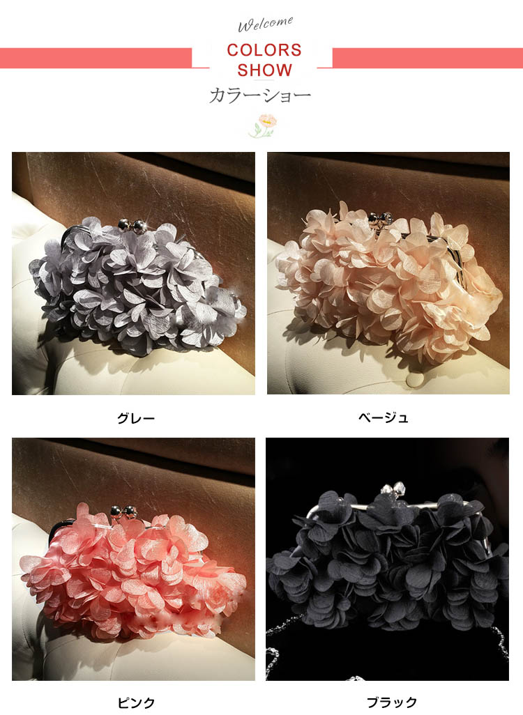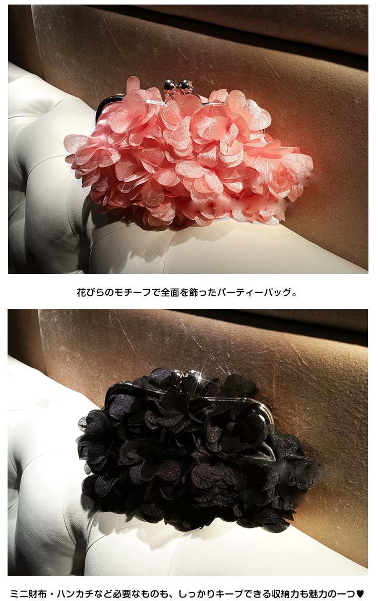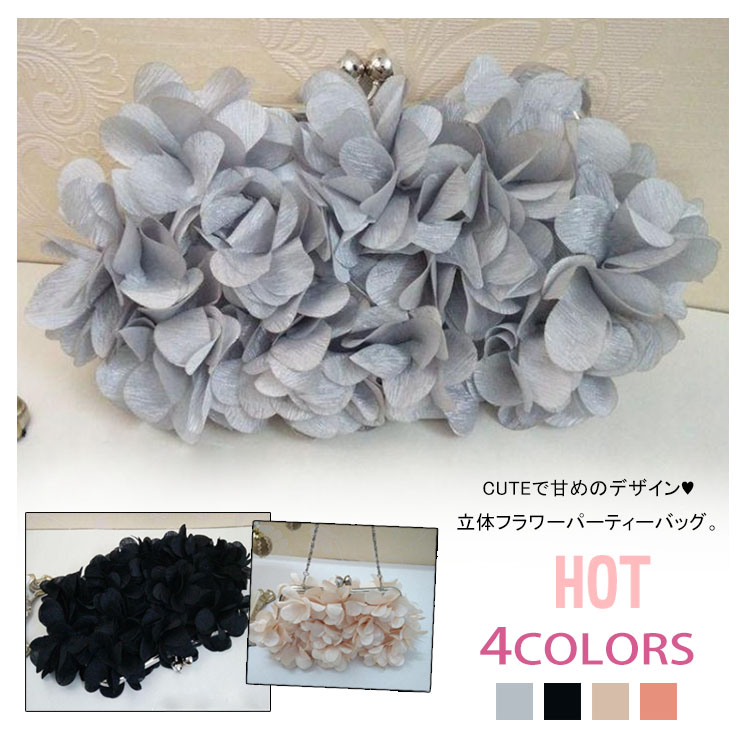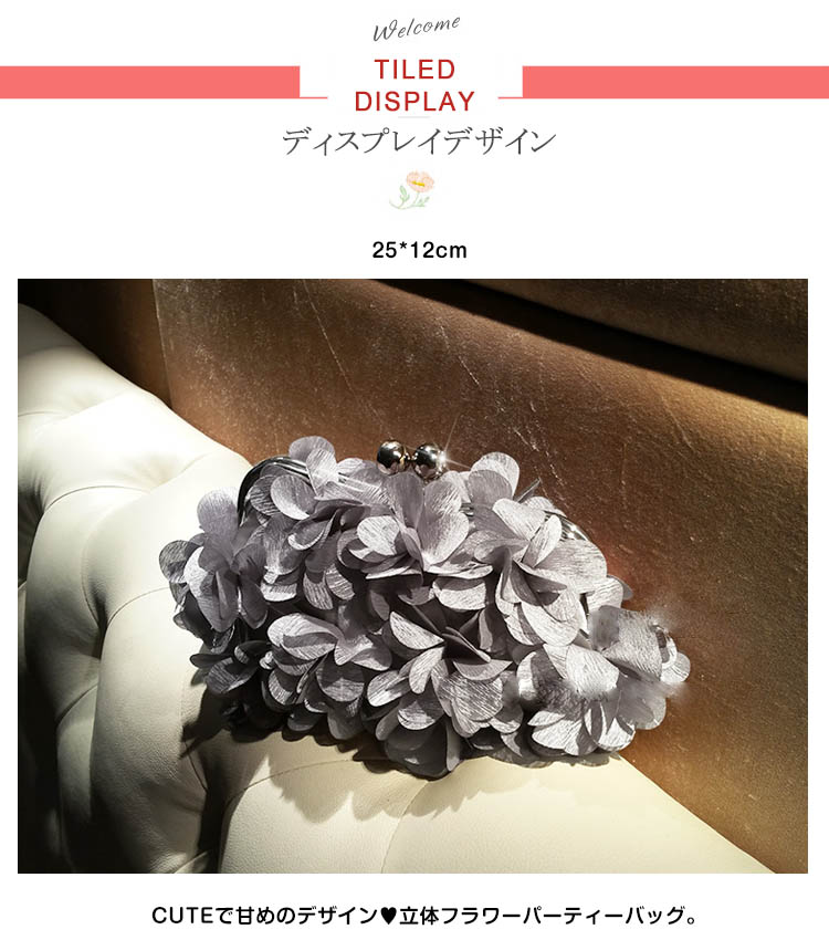 | CUTEで甘めのデザイン?立体フラワーパーティーバッグ。花びらのモチーフで全面を飾ったパーティーバッグ。ミニ財布・ハンカチなど必要なものも、しっかりキープできる収納力も魅力の一つ?大人の女性は勿論のこと、お子様に持たせてもOKな可愛らしさです。結婚式やパーティーなどに大活躍! | |