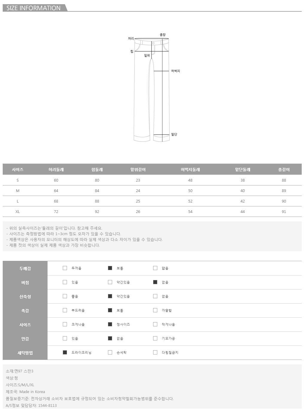 컬러는 청 1color로 구성되어 있으며, 모델의 착용 컬러는 청/S 입니다. 사이즈는 S,M,L,XL 사이즈로 진행되오니 고객님의 체형에 맞게 선택하셔서 예쁘게 착용하시길 바랍니다.