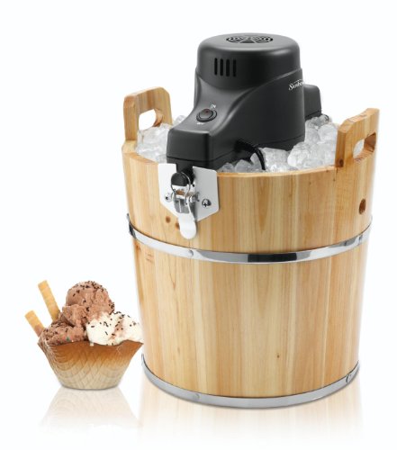 Remember 4th of July picnics from years past? Taking turns churning the ice cream, eagerly awaiting that first scoop? Bring the nostalgia home with this family-friendly ice-cream maker from Sunbeam. Housed in an antique-looking solid-pinewood bucket, but with a motorized electric crank (so you don't have to work so hard), the unit makes up to 4 quarts of delicious homemade ice cream at a time. Simply add rock salt and ice to the bucket and ice-cream mix and other ingredients to the inner container, and it takes care of the rest. Make anything from creamy, dreamy vanilla, dark chocolate, or fresh strawberry to tantalizing mint chocolate chip or cookies and cream. De-lish. Combining old-fashioned charm with modern technology, Sunbeam's 4-quart ice-cream maker amps up fun, whether celebrating a birthday or gathering with friends and neighbors for a block party or backyard barbecue.Feature