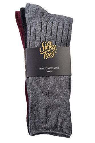 -. Binding : Apparel -. Brand : Silky Toes -. Department : mens -. Feature : NON- BINDING TOP - Gently conforms to your feet without squeezing or restricting blood circulation. / MOISTURE MANAGEMENT- Anti Sweat fibers keep your feet dry and fresh.. all day / SEAMLESS CONSTRUCTION - Seamless toe reduces the risk of infection, foot pressure, or blisters and keep your feet comfortable all day. / COMFORT- Super soft breathable cotton is guaranteed to provide ultimate comfort. / DON'T SACRIFICE ON BEAUTY- Vast array of basic dress colors to match your wardrobe. -. IsAdultProduct : 0 -. ProductGroup : Apparel -. ProductTypeName : SOCKSHOSIERY -. Title : Silky Toes 3 or 6 Pk Men's Diabetic Non-Binding Cotton Dress Socks, Multi Colors Also Available In Plus Sizes