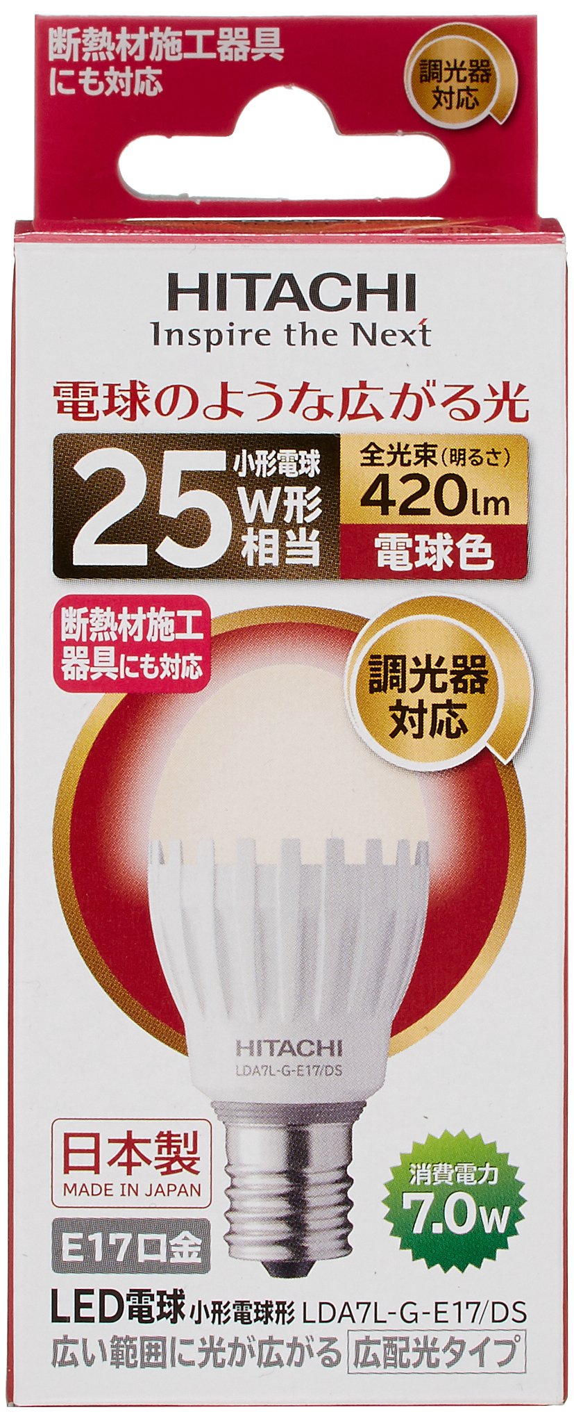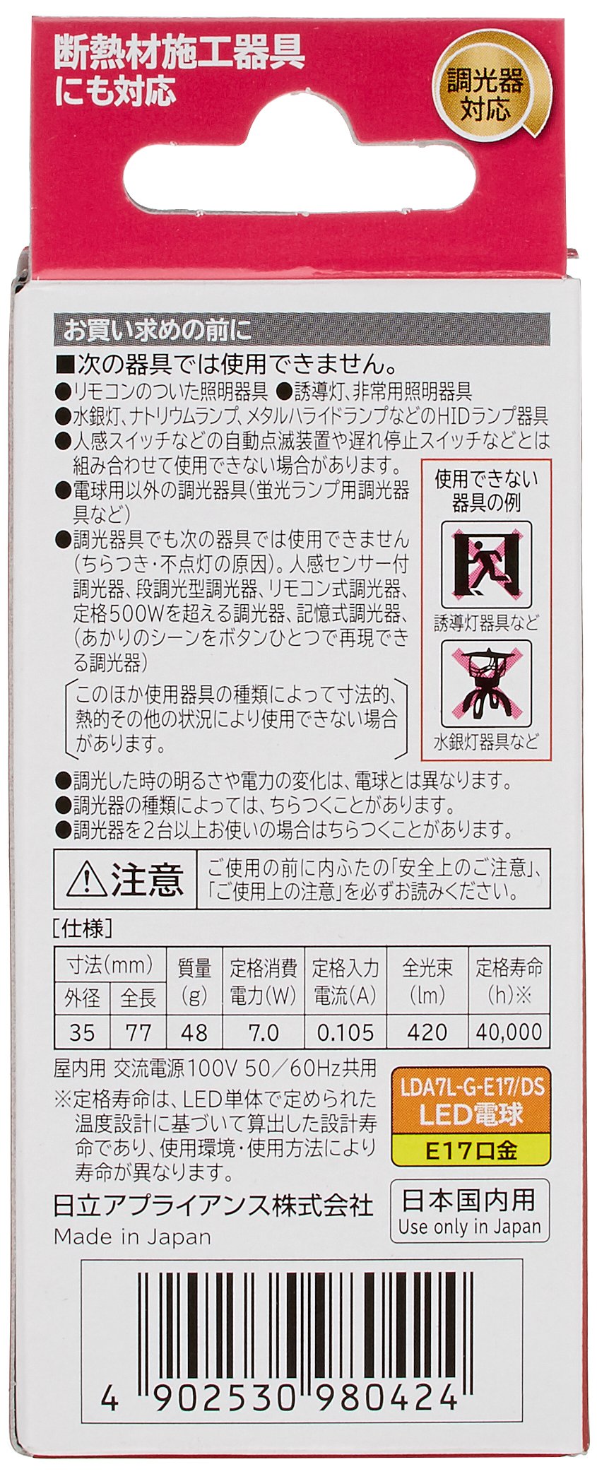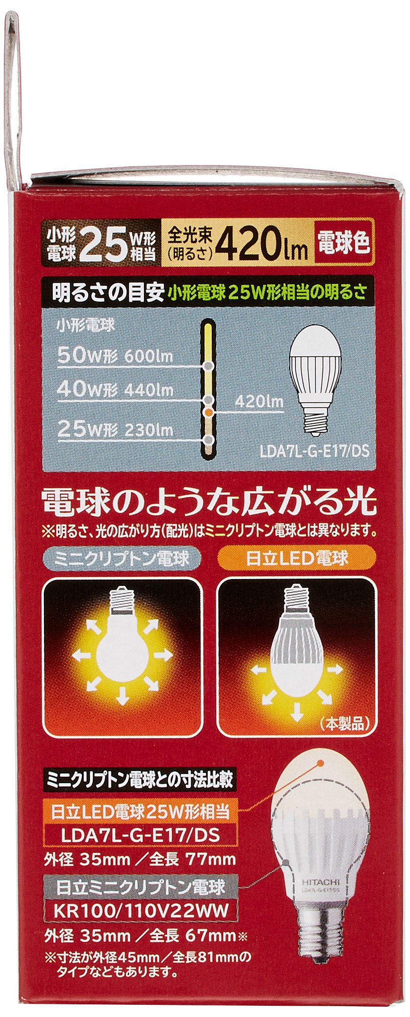 / ■ Specifications ■ Light color: equivalent to light bulb brightness: equivalent dimensions of bulb 25W (approx.): Outside diameter 35 × total length 77mm mass: 48g base: E17 total luminous flux: 420lm dimmer: compatible sealed type instrument: