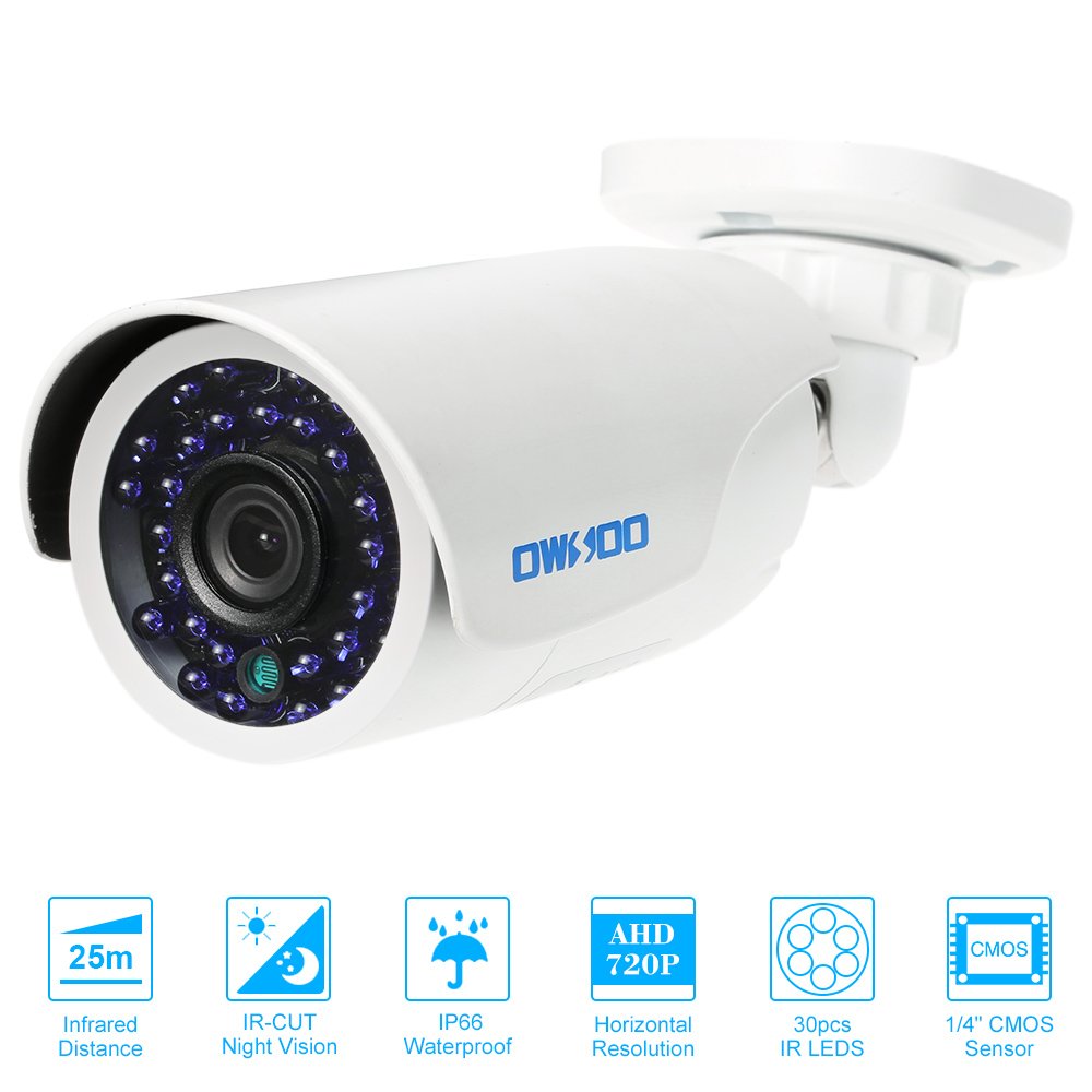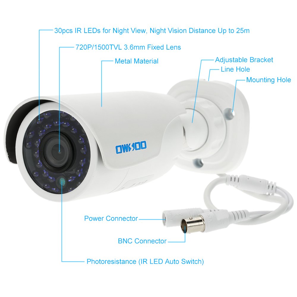 This is an AHD 720P 1500TVL CCTV bullet camera, it features a 3.6mm lens and 30 infrared lamps, night vision distance of up to 25 meters.