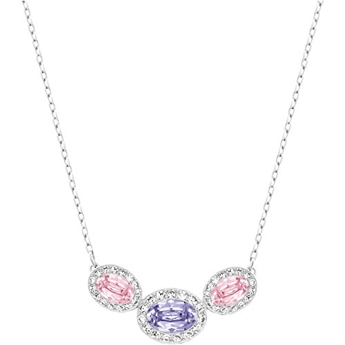 Three Oval Shaped Pastel-Colored Crystals (Pink, Clear, and Purple) in a Halo of clear crystals. On a Rhodium Plated Chain, Lobster Clasp. Length is approximately 14 7/8 inches.