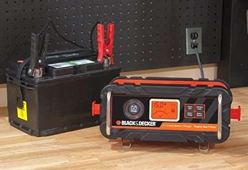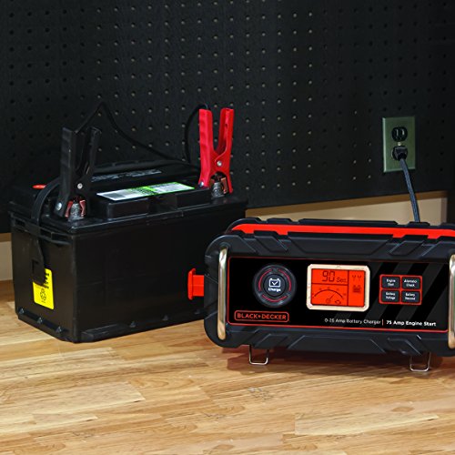 Get back on the road in minutes with the Black & Decker 25 Amp Bench Charger. Vehicle won't start? Battery needs maintenance? Just connect the battery charger clamps to the battery terminal and press charge. The battery charger automatically does the rest for optimum performance. With fast, high frequency technology, it delivers 3-stage charging - automatically switching from fast charge, to top-off, to trickle charge. This battery charger is also perfect for motor homes, jet skis, lawn tractors, generators or vehicles that sit idle for months at a time. One of the most advanced chargers on the market, the Black & Decker Bench Charger features a digital LCD screen that displays charging status and battery status with easy to understand icons. It also includes a patented alternator check to evaluate the battery voltage under load to indicate if the alternator is maintaining battery level. Even if the cables are connected to the wrong terminal, the screen alerts you. While many other battery chargers require you to select various settings like battery type and size, the Black & Decker 25 Amp Bench Charger is fully automatic and chargers up to 40 percent faster than other conventional chargers. Need to get back on the road quickly? The charger also features a patented 75 amp Engine Start to jump start your vehicle battery in 90 seconds. The built-in cord and cable wrap and clamp storage makes the charger easy to use and store. 100 percent CEC compliant and ETL Certified for performance and safety.Feature