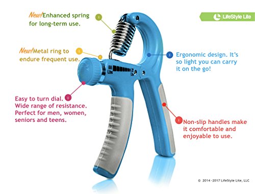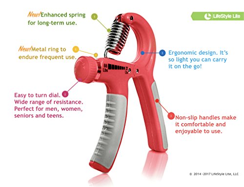 Studio : LifeStyle Lite Publisher : LifeStyle Lite Binding : Misc. Product Description DURABLE NEW MATERIALS.?LifeStyle Lite hand strengtheners will give you longer lasting improvement through silent exercises. A great product with a Super Human Customer Service Team to assist you. Great for rehabilitation and physical therapy:? Beneficial for people who have tennis elbow, arthritis, carpal tunnel syndrome and rheumatoid arthritis. COMFORTABLE QUIET:?The rubber grips on the handles help prevent it from accidentally slipping out of your hand when it gets sweaty. The curved handles make it comfortable to grip and allows for several different grip positions to vary your workouts. This handgrip fits big or small hands. EASY TO USE ADJUSTABLE.?With our BONUS PDF guide, it will be easy to measure and adjust from 22-88 pounds of resistance with a twist of a dial. This will let you adjust the resistance to match your ability and you can increase the resistance as you gain strength. 0