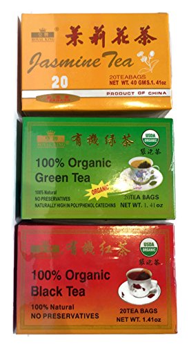 -. Binding : Misc. -. EAN : 0630299212817 -. Feature : This sampler set of fine Chinese teas includes 1 box of each (20 tea bags per box) 100% Organic Green Tea, 100% Organic Black Tea, and Jasmine Tea (total of 60 teabags). This set makes a wonderful gift to any tea lover or a perfect addition to any home. / These teas contain an abundance of essential nutritional elements to promote optimal health and well-being. / 100% USDA Organic Green Tea has no preservatives and is naturally high in Polyphenol Catechins- a powerful antioxidant. Green Tea is also used to aid in weight loss and fat burning. / 100% UDSA Organic Black Tea has a full, robust flavor with a unique pleasing aroma. It is all natural and full of antioxidants and flavonoids to promote a healthy lifestyle. / Jasmine Tea has the unique taste and benefits as green tea but also the lovely fragrance of sweet-smelling Jasmine flowers to help you relax and unwind. -. IsAdultProduct : 0 -. Label : Royal King -. Manufacturer : Royal King -. PackageQuantity : 3 -. ProductGroup : Grocery -. ProductTypeName : GROCERY -. Publisher : Royal King -. Studio : Royal King -. Title : Chinese Tea Sampler Set- 100% Organic Green Tea, Jasmine Tea and 100% Organic Black Tea (3 boxes of 20 teabags; 60 teabags total) -. UPC : 630299212817
