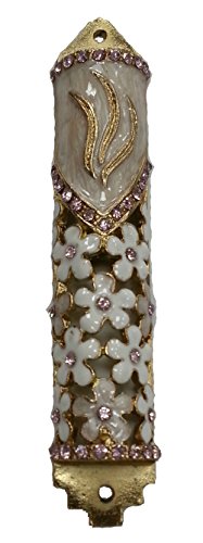 Mezuzah Case - Handmade Jewled White Floral Design, Holds 2.5" Scroll