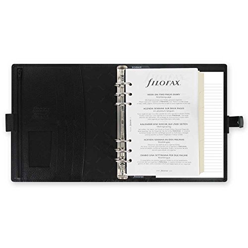 -. Feature : Includes a weekly 2015 calendar, blank index (cream) 6 tabs, frosted ruler/page marker, assorted notepaper, to-do list, and contacts / Featuring 6 rings and a snap closure / Inside left has large pocket, several card slots, and leather pen loop / Inside right has 1 notepad slip pocket and leather pen loop / A5; Paper size 8-1/4" x 5-3/4"