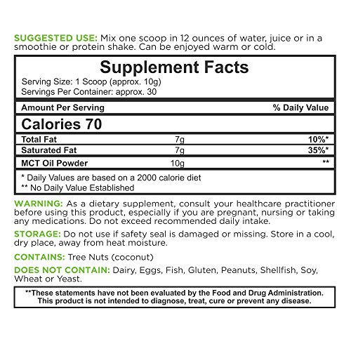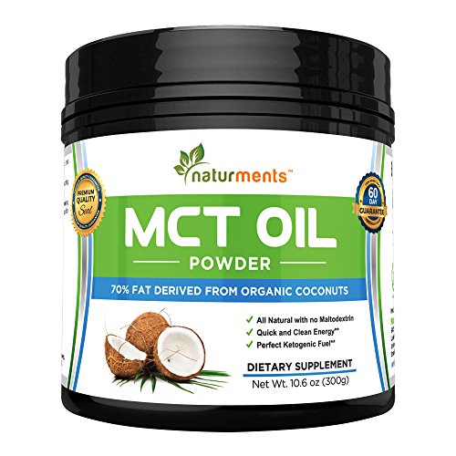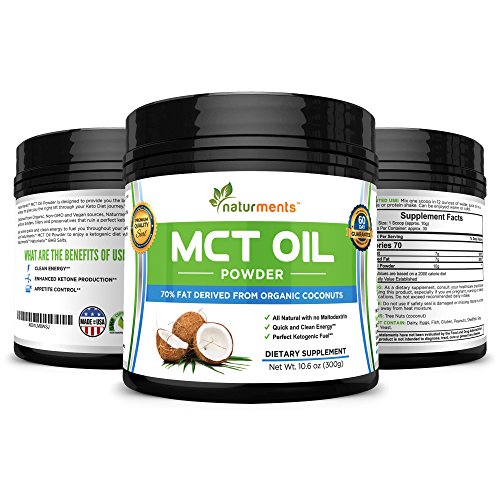 PREMIUM COCONUT BLEND Unlike competitors, Naturments MCT oil powder mix contains 70% organic coconut oil without artificial fillers, binders or preservatives. Whether you are partaking in a purified ketogenic diet, or simply looking for a natural, healthy supplement, our powder is for you. CLEAN KETO FUEL Medium-chain triglycerides serve as a healthy, lean fat source that easily create ketones in the body to enhance clean energy levels, improve your overall mental performance and focus levels, aid in craving reduction and appetite suppression, and serve as a digestive gut health support. For those following a ketogenic diet plan, our powder is the ideal dietary supplement and fuel source. EDIBLE ENHANCEMENT MCT oil powder is the ideal natural, energy boosting health additive to help you create creamier recipes and beverages that support digestive health and focus levels. Mix one scoop of the powder into your coffee, sports protein shake, juice, water or smoothie and feel more energized and fuller, longer. 100% NATURAL Our powder is perfect for those with special dietary restrictions or personal nutrition avoidances. Naturments bulk MCT oil supplements powder is vegan, Non-GMO, GMP certified, FDA registered, and free of dairy, eggs, fish, gluten, peanuts, shellfish, soy, wheat, yeast and maltodextrin, so you can rest assured that you are not consuming any harmful byproducts or allergens. SATISFACTION GUARANTEE At Naturments, we strive to help our customers achieve healthier, more energized lives. We stand behind the quality and ability of our products, but if you are not completely satisfied with your purchase, you may return your item within 60 days for your money back. - Ingredients: 100% MCT Oil From Natural Sources - 10.6 ounces (300 grams) - Good Manufacturing Practice Certified and FDA Registered - Made in the USA - 60 Day Satisfaction GuaranteeFeature