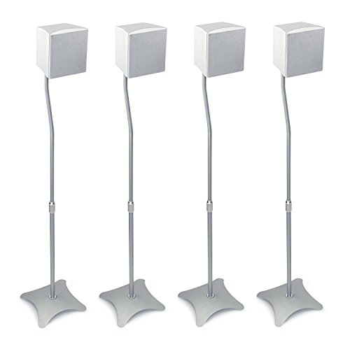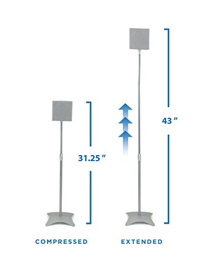 -. Feature : Universal Surround Sound Speaker Stands (4 Stands) for home theater system satellite speakers. Ideal for front pair and rear pair positions for a 5-speaker setup. Compatible with most speakers on the market such as Bose Acoustimass, Bose Cinemate, Jewel Cubes, Lifestyle Speakers, Samsung, Klipsch, Yamaha, Polk, JBL, Panasonic, etc / The pole height is adjustable from 31.25 inches to 43.3 inches, to place your speakers at optimal height for stereo or surround sound quality. The adjustability makes for easy storage and transportation. Each heavy-gauge offset steel pillar features an integrated wire channel for cable management system inside the middle of the stands / Floor-standing attractive, sleek design lets you put speakers in the best position for sound quality. The heavy cast-iron base has four legs to provide stability and reduce secondary sound vibrations, even on thicker carpets. The fashionable architecture and slim engineering perfectly aligns with modern minimalist décor / The curved, in-set, neck design of the pole balances the speakers directly above their base. This improves sound performance, stability, and elegance of the mount. This audio accessory is dedicated to getting the most out of your Hi-Fi system / Includes top plate, L-shaped brackets and keyhole adapter, stable floor standing base. Multiple speaker attachment methods for universal assembly, including keyhole style, single bolt or screw type. Mount speakers using ¼ inch x 20 mounting screws or keyhole mounts; Fits Single Thread Type Fitting, all hardware provided