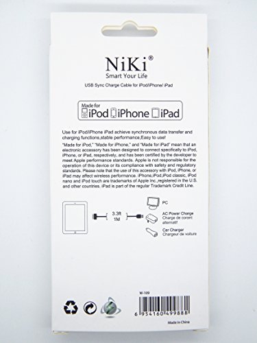 - Title : [Apple MFI Certified - Lifetime Warranty] NiKi® 3.3 Feet 30 pin USB Sync and Charging Cable for iPhone 4 / 4S, iPhone 3G / 3GS, iPad 1 / 2 / 3, iPod nano 5th / 6th generations and iPod Touch 3rd / 4th generations, White (Retail Packaging)