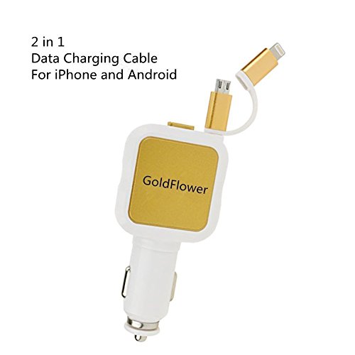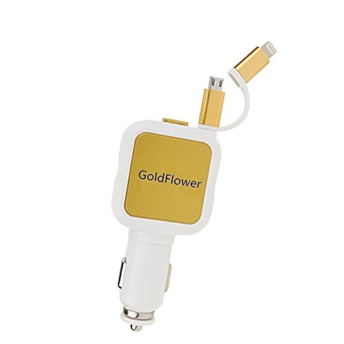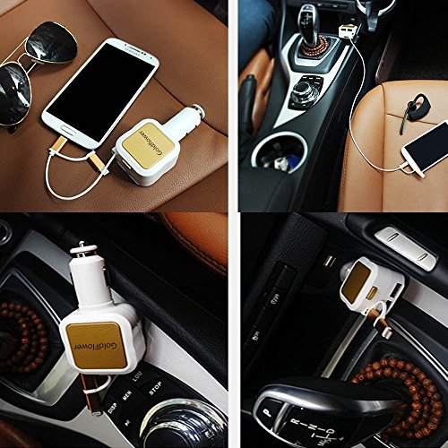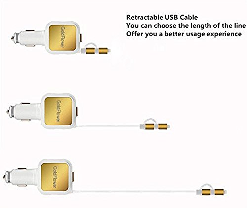 Goldflower Car Charger (24W/4.8A 2 Ports)with Retractable cord 2 in 1 Charging Connector for iPhone 6S/ 6s Plus, iPad Air 2 / mini 3, Galaxy S6 / S6 Edge and More (White-gold)