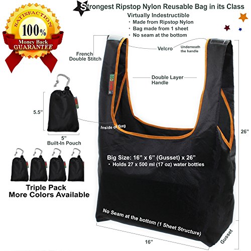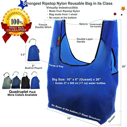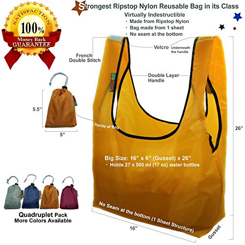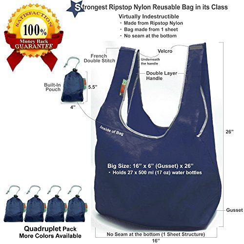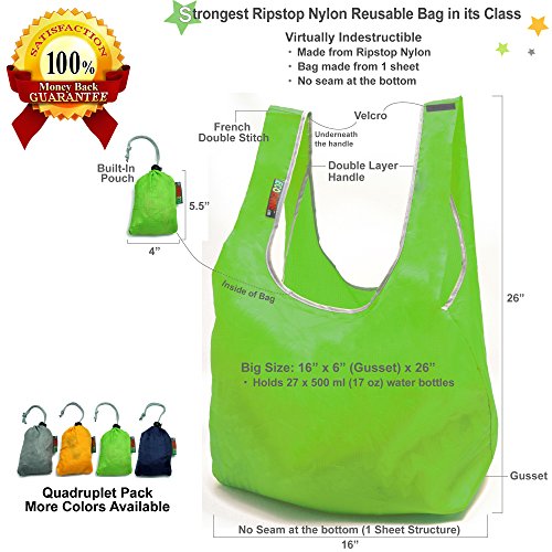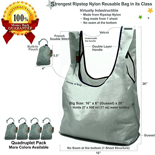 THE STRONGEST REUSABLE BAG : 100% Ripstop Nylon with Several Innovative Features such as Folded Handle with Edge Lining and One Sheet Structure with No Seam at the Bottom. The Strongest Bag in Its Class - Virtually Indestructible.