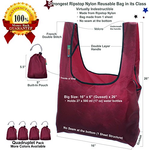 EcoJeannie® 4 Pack Super Strong Ripstop Nylon Foldable Reusable Bag Grocery Shopping Tote Bag with built-in Pouch, RBS041