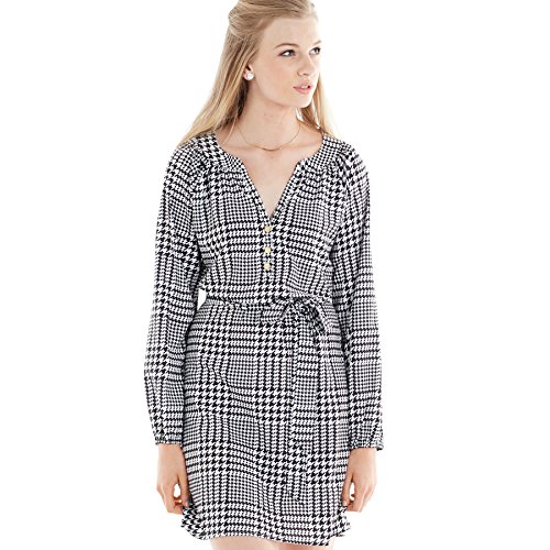 Poly crepe shirtdress has removable waist tie and three gold Mud Pie logo buttons at placket.