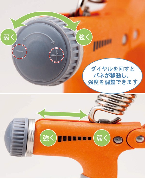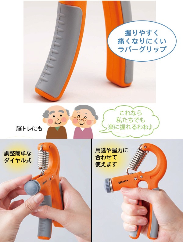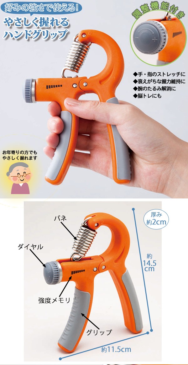 | 用途や自分の握力に合わせて強度を調整できるハンドグリップ。強度の違うハンドグリップをいくつも揃えなくても、ひとつで段階的にトレーニングができます。調整は簡単なダイヤル式。握りやすく手が痛くなりにくいラバーグリップで長時間の使用もストレスになりません。手・指の軽いストレッチや衰えがちな握力維持、筋力アップやトレーニングまで幅広い用途で使えます。 |