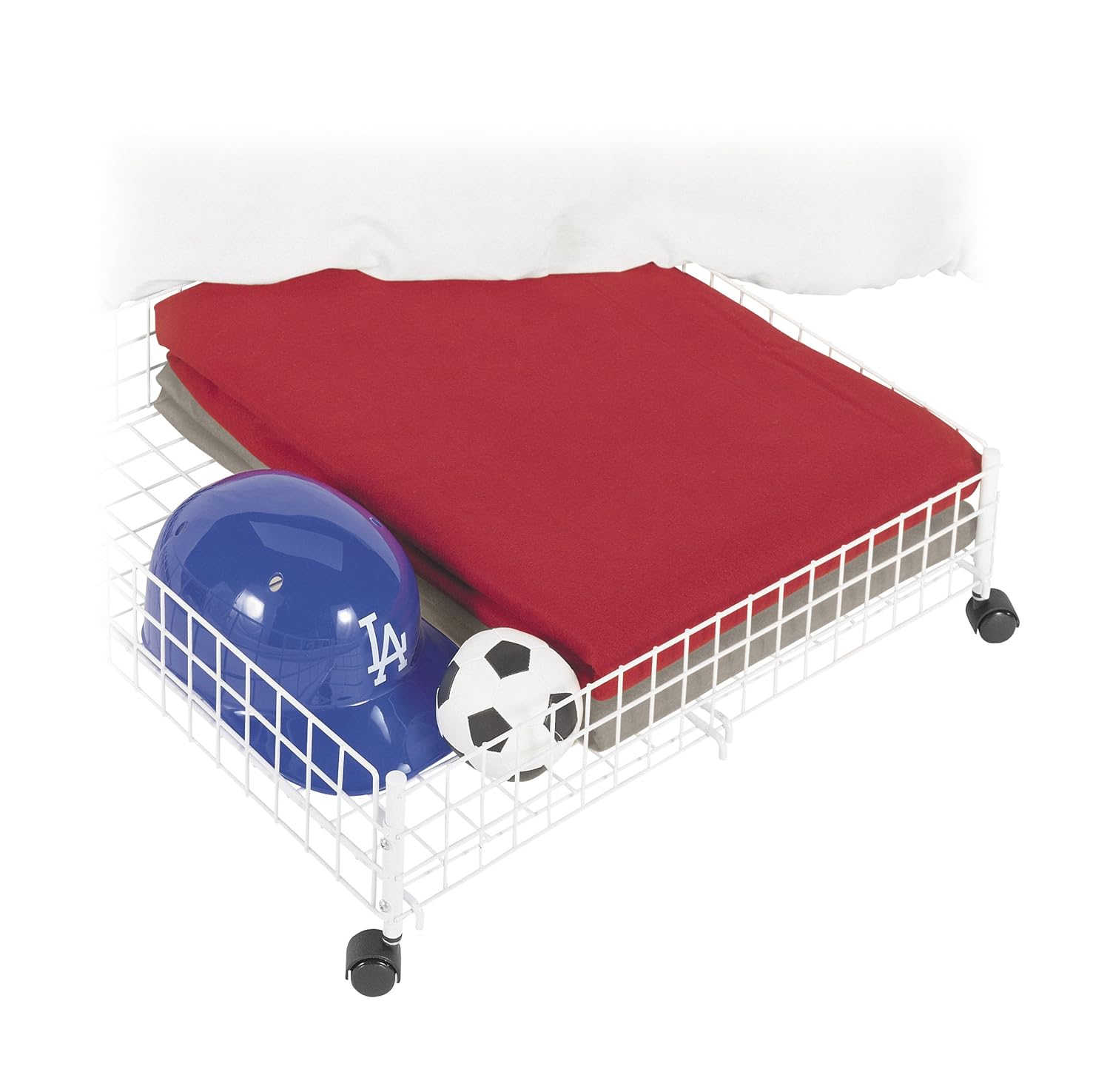 Since the underbed cart rolls on wheels, it is convenient to store not only under a bed, but also under hanging clothes, in the garage and travel trailers/motor homes where storage is limited. Made of durable steel and coated with white epoxy. Use to store blankets, linens, toys, all kinds of items. The caster wheels are made of heavy duty plastic and allows cart mobility.