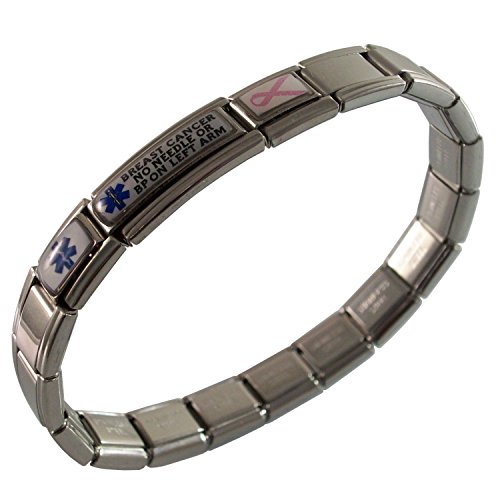 -. Binding : Jewelry -. Brand : Gadow Jewelry -. Department : womens -. Feature : medical charm is hand crafted / stainless steel bracelet, stretches over your wrist / FREE sizing of your bracelet / links or charms can be taken out, more added, moved around / you will receive instructions on how to take out or add links or charms -. Label : Gadow Jewelry -. Manufacturer : Gadow Jewelry -. Model : JKUM-214 -. MPN : JKUM-214 -. PartNumber : JKUM-214 -. ProductGroup : Jewelry -. ProductTypeName : FASHIONNECKLACEBRACELETANKLET -. Publisher : Gadow Jewelry -. Studio : Gadow Jewelry -. Title : Breast Cancer No Needle or BP on LEFT Arm Medical ID Alert Italian Charm Bracelet