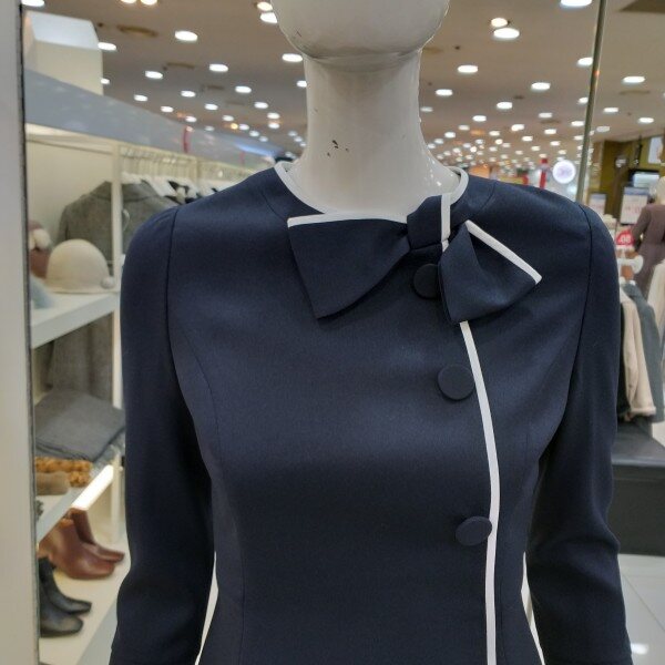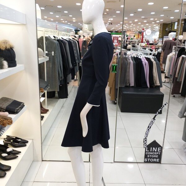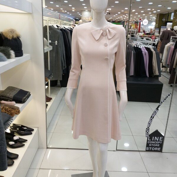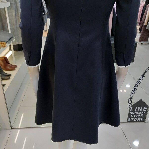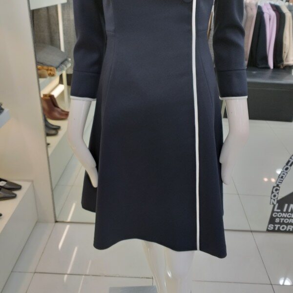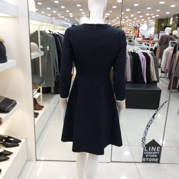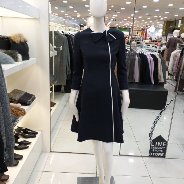 라인 어디션 19봄 신상 리본 디테일의 포인트 칼라 배색이 있는 플레어라인의 원피스 입니다.포인트 배색이 있어 단조롭지 않으며, 단정하면서여성스러운 아이템입니다.7부 기장의 소매로 늦은 봄까지 착용 가능한원피스입니다.