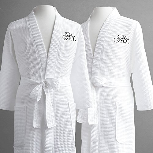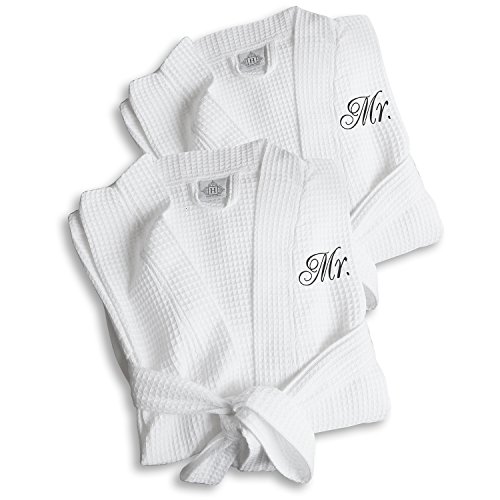 Same-Sex Couple's Waffle Weave Bathrobe Set-100% Egyptian Cotton-Unisex/One Size Fits Most-Spa Robe, Luxurious, Soft, Plush, Elegant Script Embroidery-Luxor Linens-Mr./Mr. with Gift Packaging