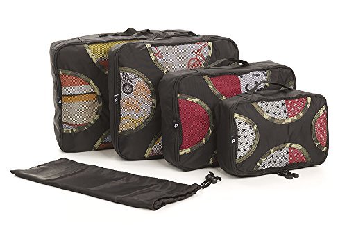 4 Packing cubes: Extra large (17.5" x 12.75" x 4"), Large (13.75' x 12.75" x 4"), Medium (13.75" x 9.75 x 4") and Small (11" x 6.75" x 4"). Laundry Bag includes to help separate dirty clothes (20.75" x 14.5")