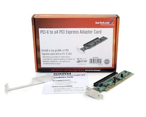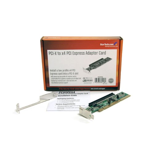 The PCIX1PEX4 PCI-X to x4 PCI Express Adapter lets you install a low profile/half-height x4 PCI Express card into a full height PCI-X (3.3V, 64-bit) slot on a server or other high-end motherboard. With a physical x16 PCI Express female slot connector, the PCI-X to PCIe adapter card accepts all types of x16/x8/x4/x1 physical PCI Express cards (maximum speed of x4), allowing an older system to run the newest cards. Backed by a StarTech.com 2-year warranty and free lifetime technical support.Feature
